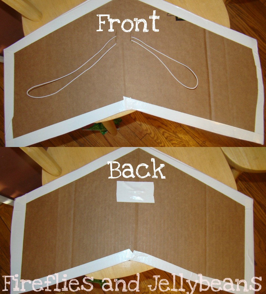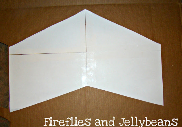 2. Open your template up and it should look like a dart shape. (my wings are 11" tall and 22" wide) Place it on your cardboard piece and trace around it. Use your box cutter to cut out your wings. Careful to always cut AWAY from yourself so you don't hurt yourself.