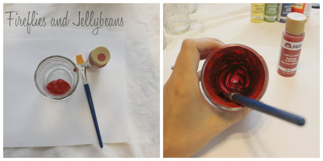 1. Pour your paint directly into your mason jar. Use your brush to paint all around the sides and the bottom of your jar. Give it a good thick coat of paint.