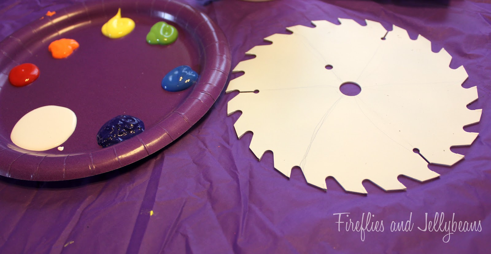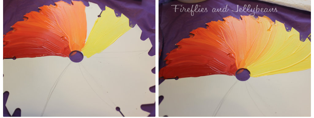 1. Use a paper plate to put all of your paint on. I put all my on at once since I was going to blend the colors. Prime your blade. I also marked off my blade into 6 sections so that the colors would look even. {I used a spray paint primer, but you could brush yours on too. Use what you have.}