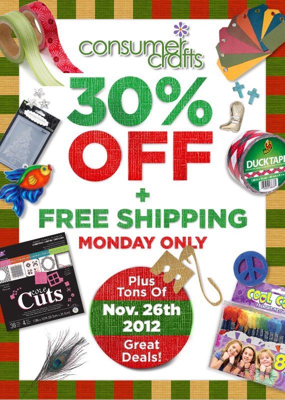 I have an awesome deal alert for you for some of the best online craft supplies around! ConsumerCrafts.com is having an amazing sale On Cyber Monday! On Nov 26th they are having 30% off and FREE shipping! Make sure you mark your calendars for these great deals!