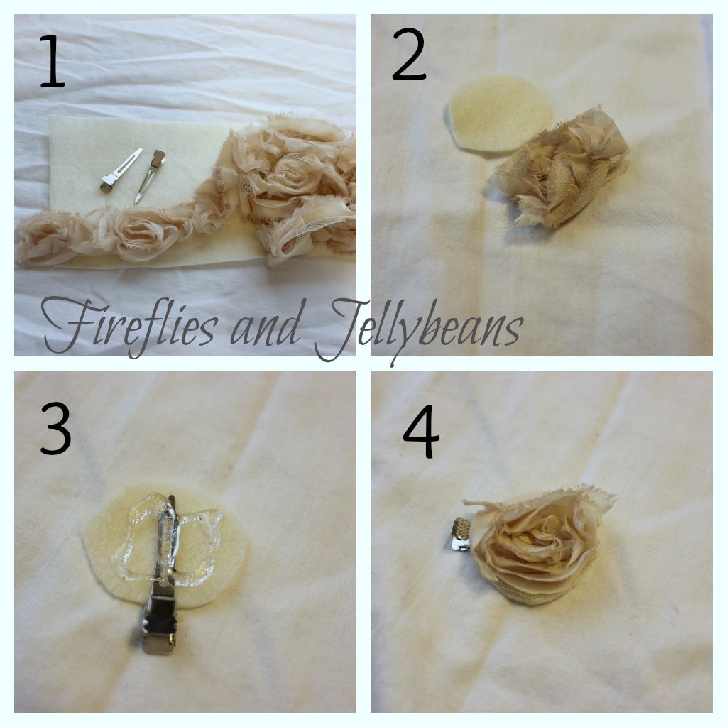 1. Start with clips, felt, flower lace trim and hot glue (not pictured)