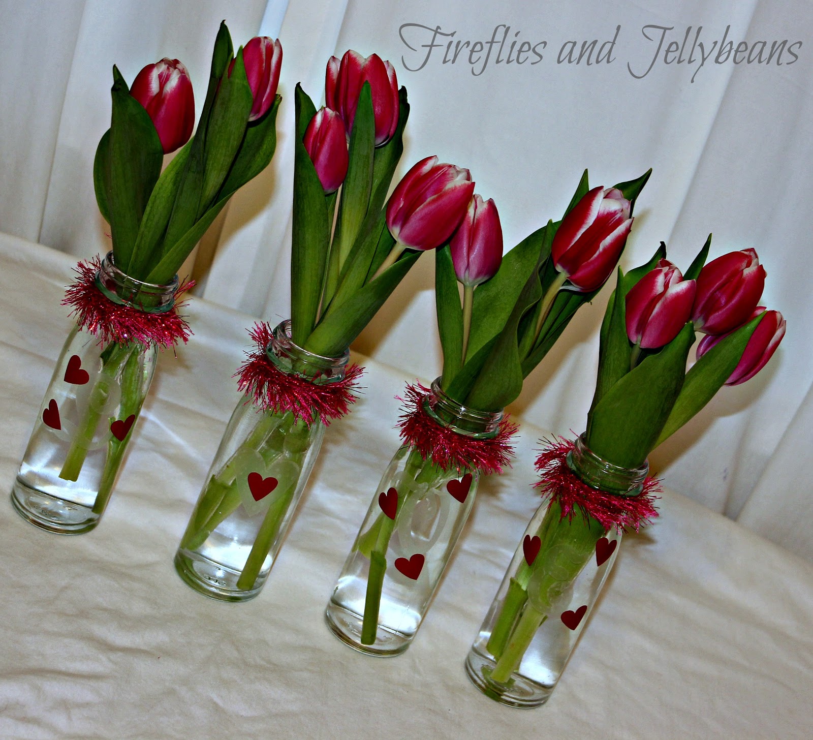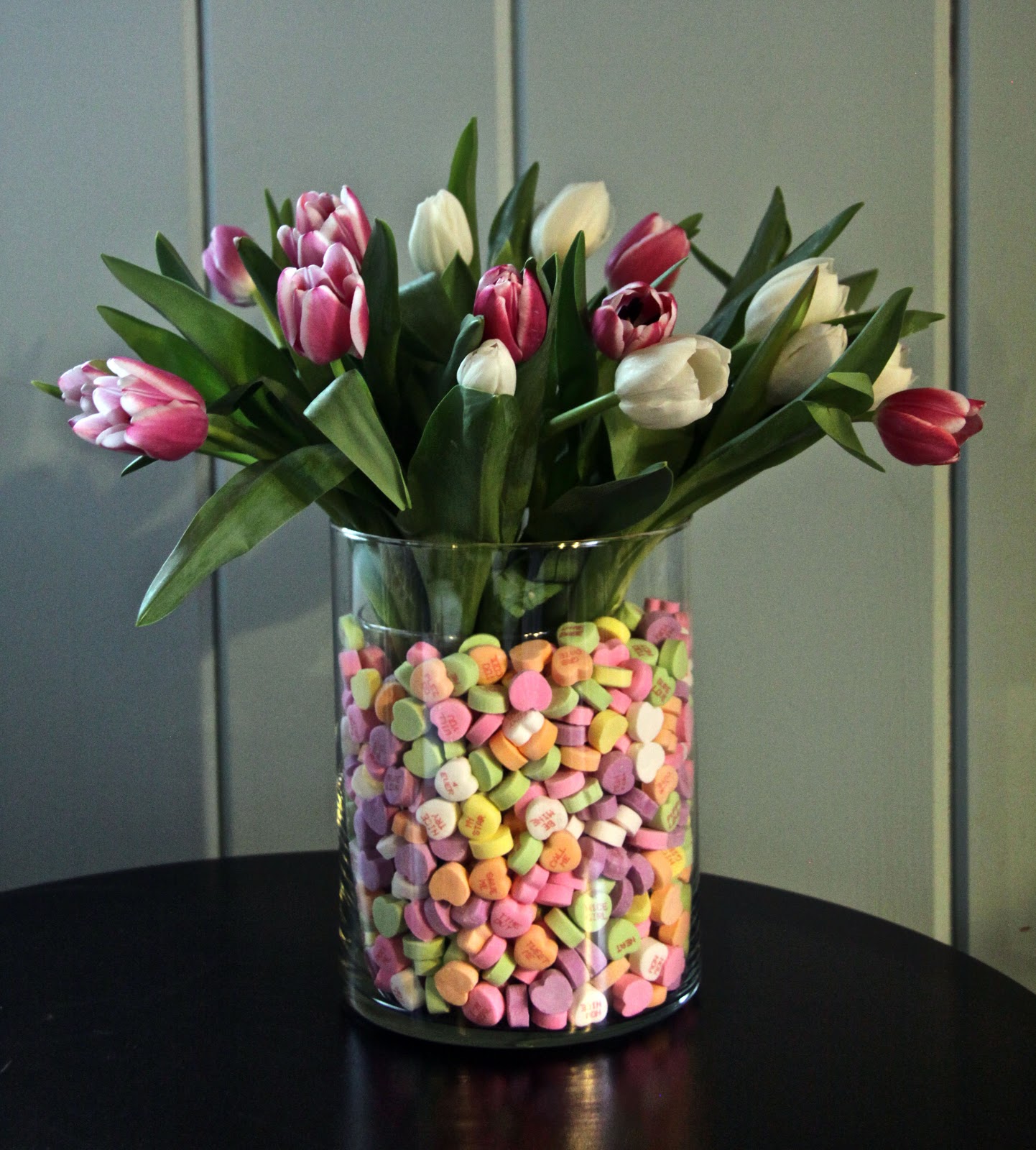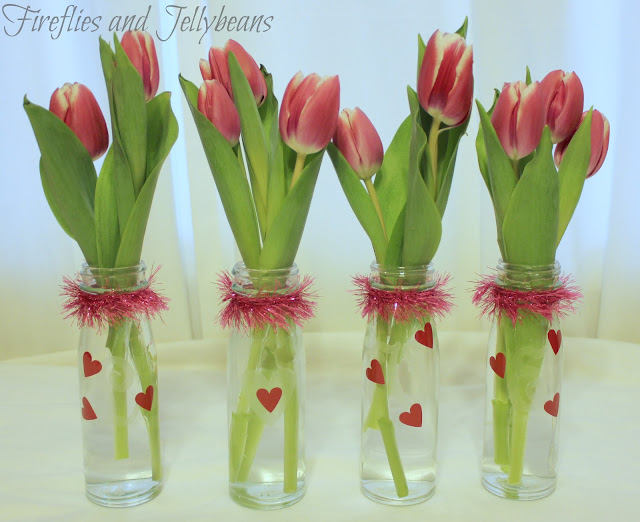 Use 2 vases (a bigger and smaller one) place the smaller one inside the bigger one and put heart candies around it. Then put the water and tulips in the smaller one!