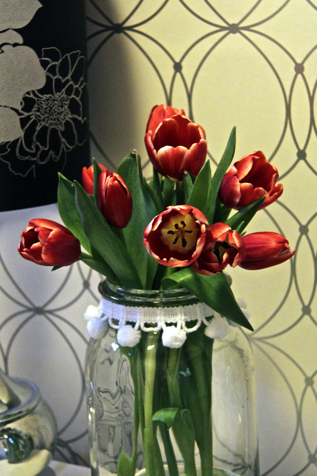 Use some pom-poms or lace trim to a decorative jar and add the tulips to it!