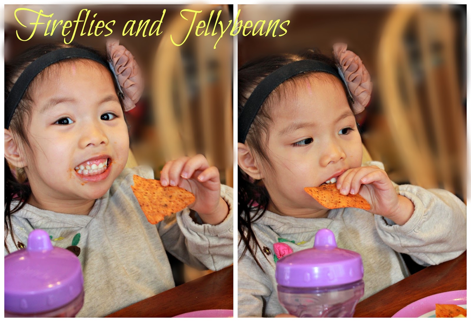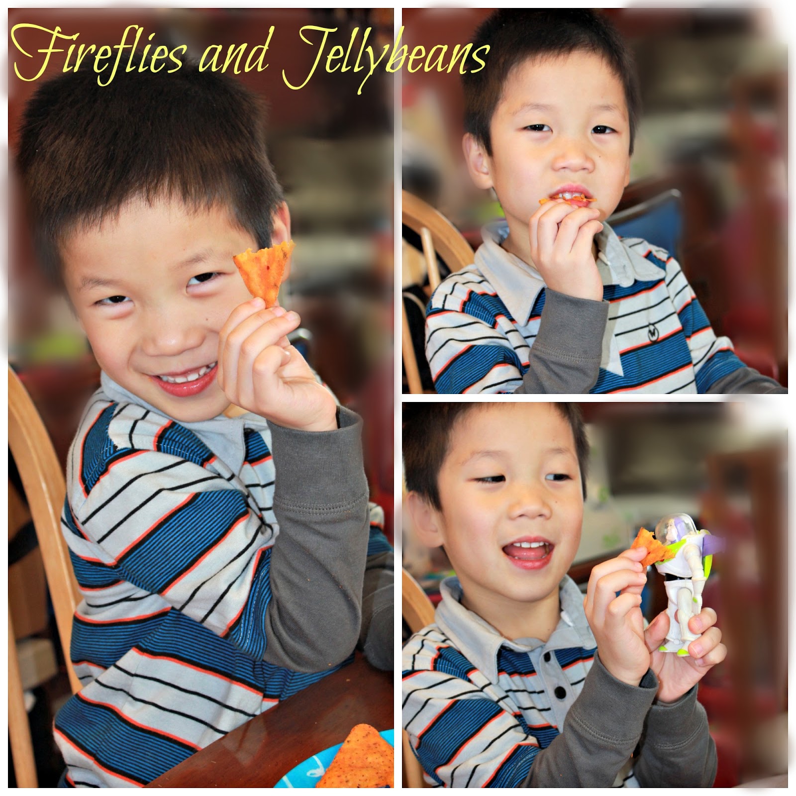 My son is by far the pickiest eater in our house. There are a handful food that he will eat. And as you can see- he liked the chips. He liked them enough to share them with Buzz Lightyear... and that is saying something. Buzz gets nothing but the best!