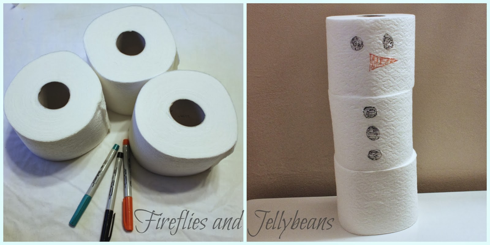 The snowman is so easy! Just use some sharpies to draw a snowman face and buttons on the TP and stack them up!