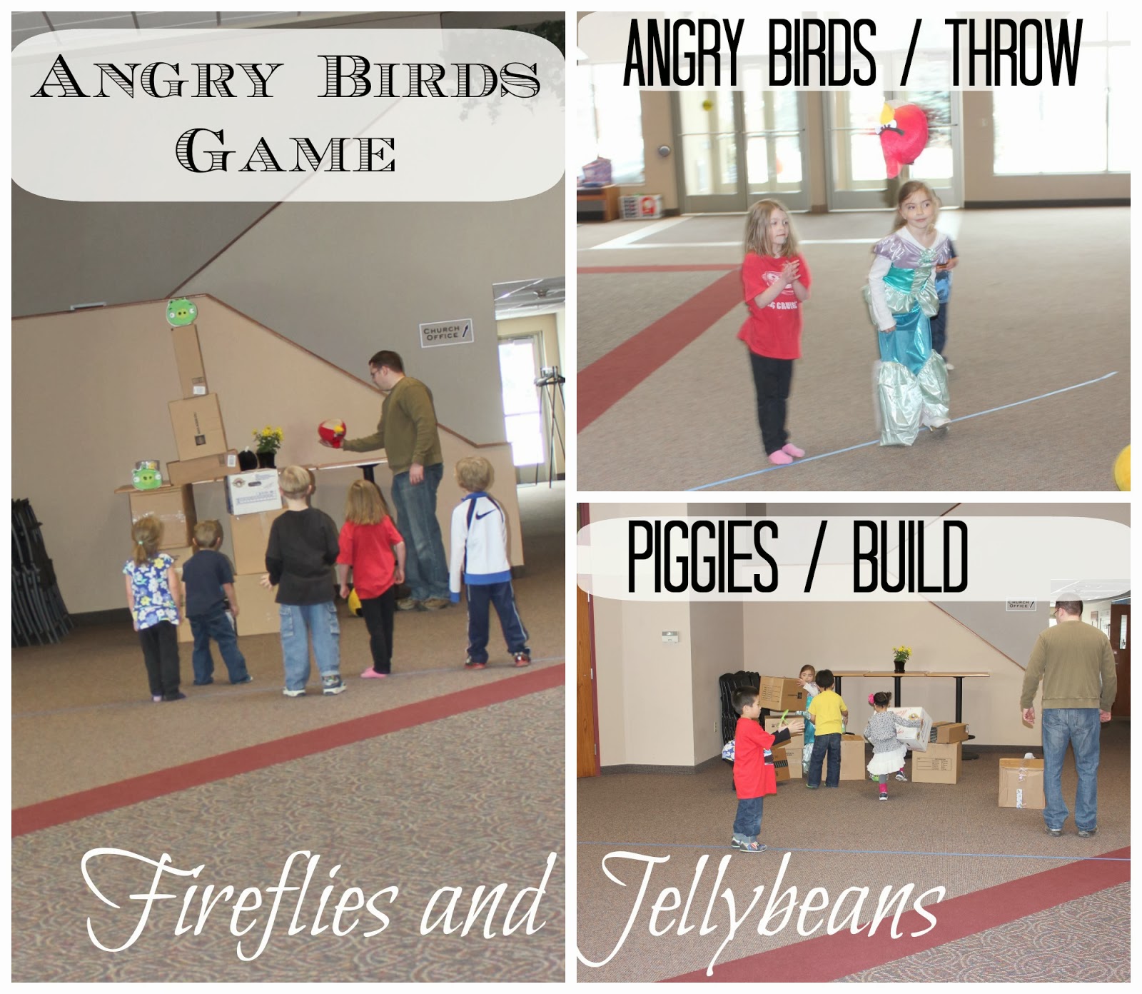 This is a version of Ships Across the Ocean - and also needs no props. One or Two kids are chosen to be piggies. They stand in the middle. The rest are Angry Birds- who are lined up on a line or wall. I yelled "Angry Birds- GO!" and all the kids ran across the room as the piggies try and tag them. If they get tagged they become a piggy too. The last 2 kids standing are the next rounds piggies to start. You can play several rounds!