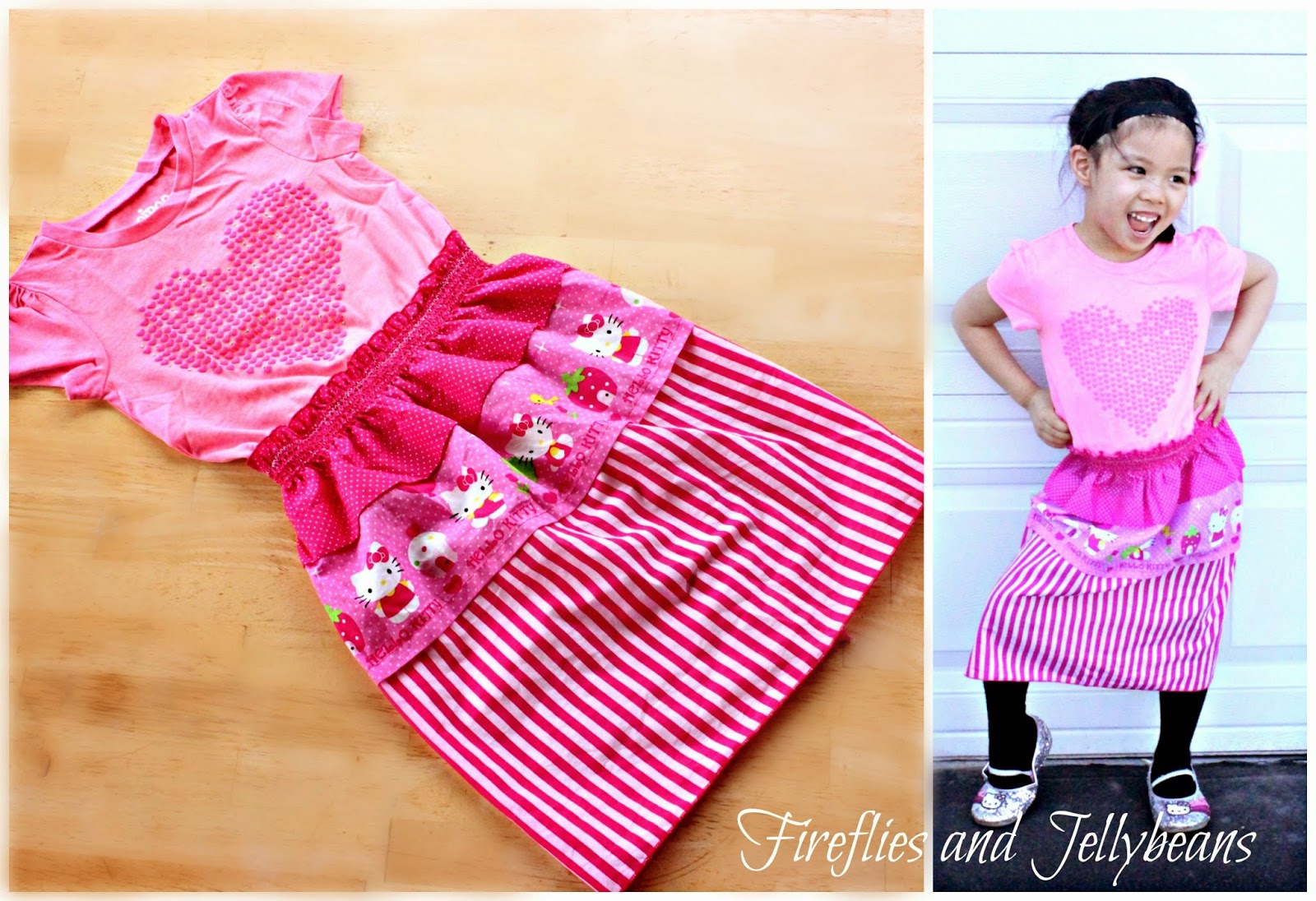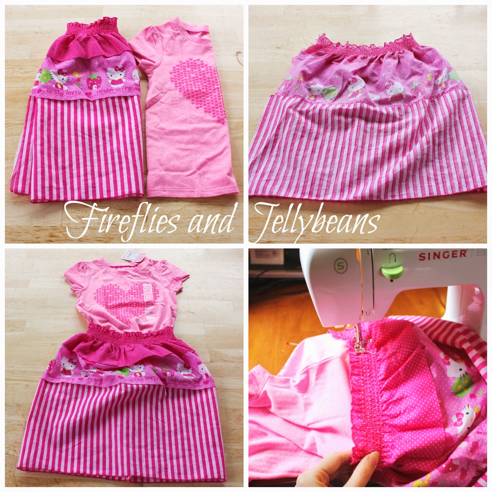 4. Sew on the top of the dress. While you are sewing stretch out the skirt so that the elastic is taunt- this will help the t-shirt gather in the right places. Sew all the way around the skirt. I used a small zig-zag stitch but you can also use a straight stitch.
