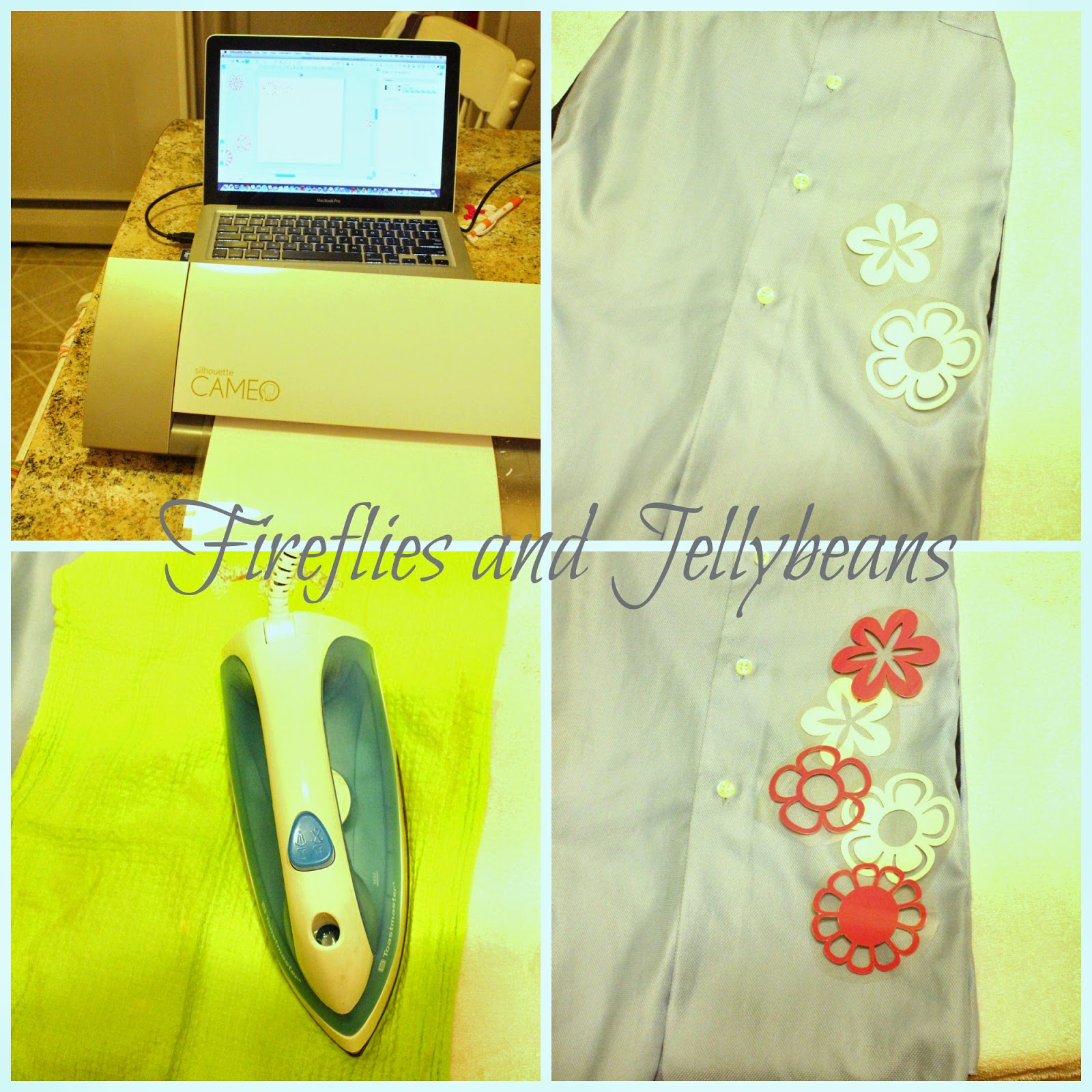 1. First pick your shapes and cut them out on the silhouette. If you are using words make sure you mirror image them before you cut or it will turn out backwards (learn from my mistakes!) You want your Heat Transfer to be shiny side DOWN.
