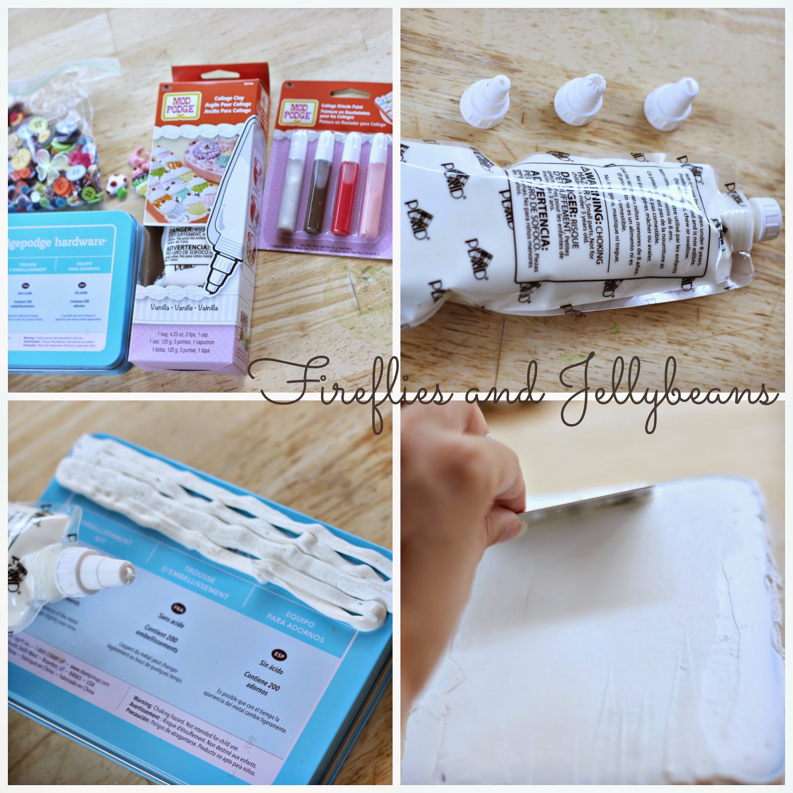 1. Supplies: Collage Clay, Collage Drizzle Paint, trinkets to decorate with (Buttons, gems, charms etc), Tin box or some thing to embellish.
