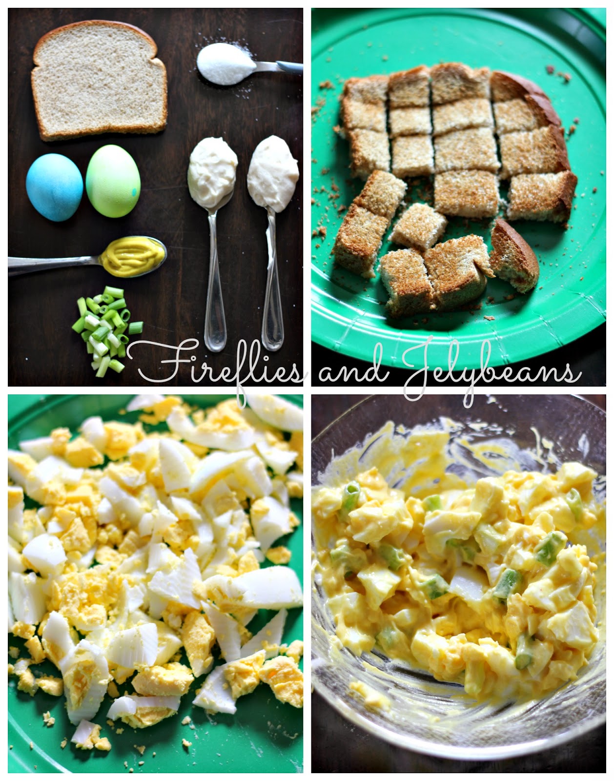 1. Gather ingredients: 1 piece of bread, 2 hard boiled eggs, 1 teaspoon mustard, 2 tablespoons mayo, 1 teaspoon sugar, and 1-2 green onions diced.