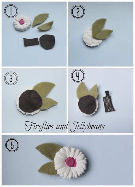 1. Create your clay flower (let dry for 24 hours) and cut out some leaf shapes plus a circle and small rectangle (to fit your hair clip) out of felt.