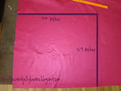 2. Cut out your sides. Lay the felt out flat (folded in half - that way you can cut 2 sides out at once!). When you cut out your sides you want to add an inch to each side length. So the sides of my house are 33 X 29 inches. The roof is going to be 33 X 33 inches. I used my yard stick to mark off each side.
