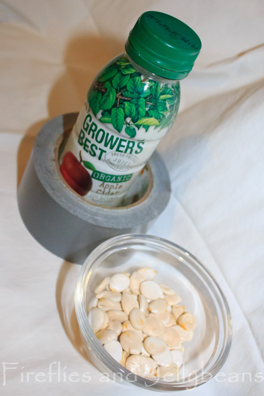 So, using nothing but things I already had in my house, I made him this shaker. It's not fancy, but it could easily be made prettier. My son is 3, and couldn't care less if his shaker is pretty, all he wants is for it to make noise. All you need is squash seeds, duct tape, and a water or juice bottle.