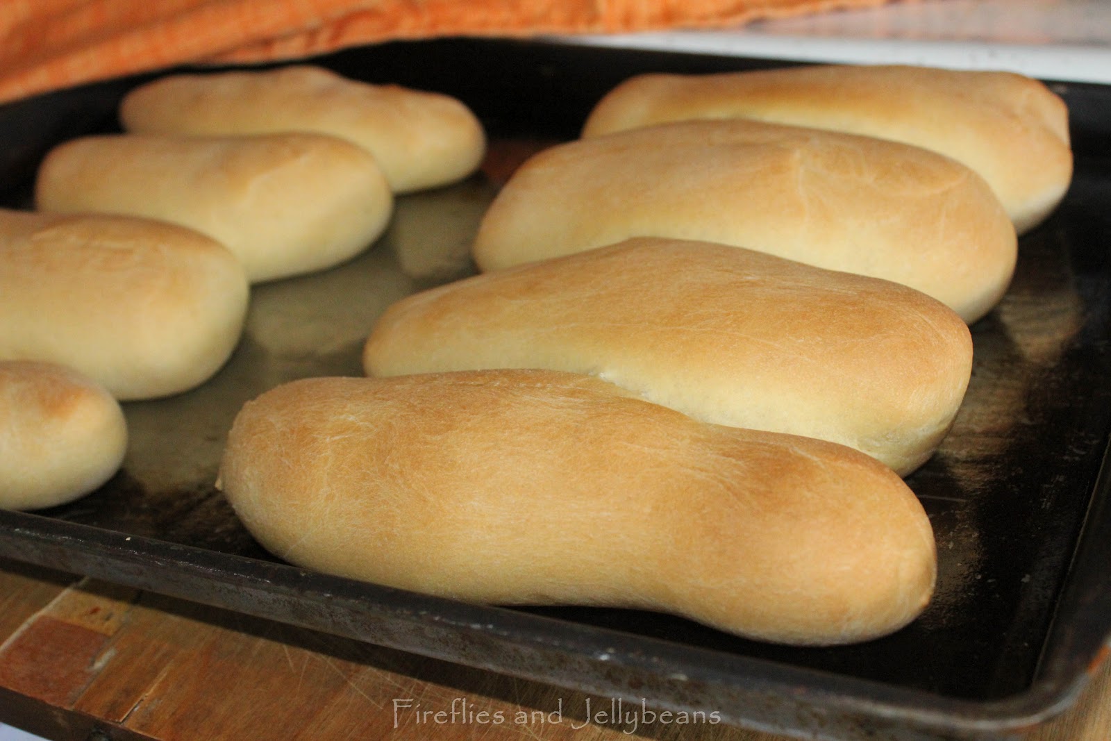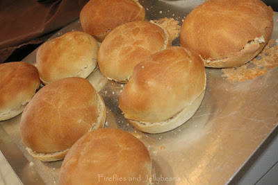 I use this bread recipe. After shaping into a loaf, I sliced it into 10 pieces (kind of how you would slice cinnamon rolls). The first time I made them I made 8 buns, and they were a bit too big, even for large brats. But if you like large buns {I am cracking up right now}, then by all means make them bigger!