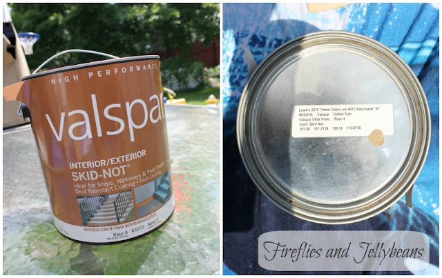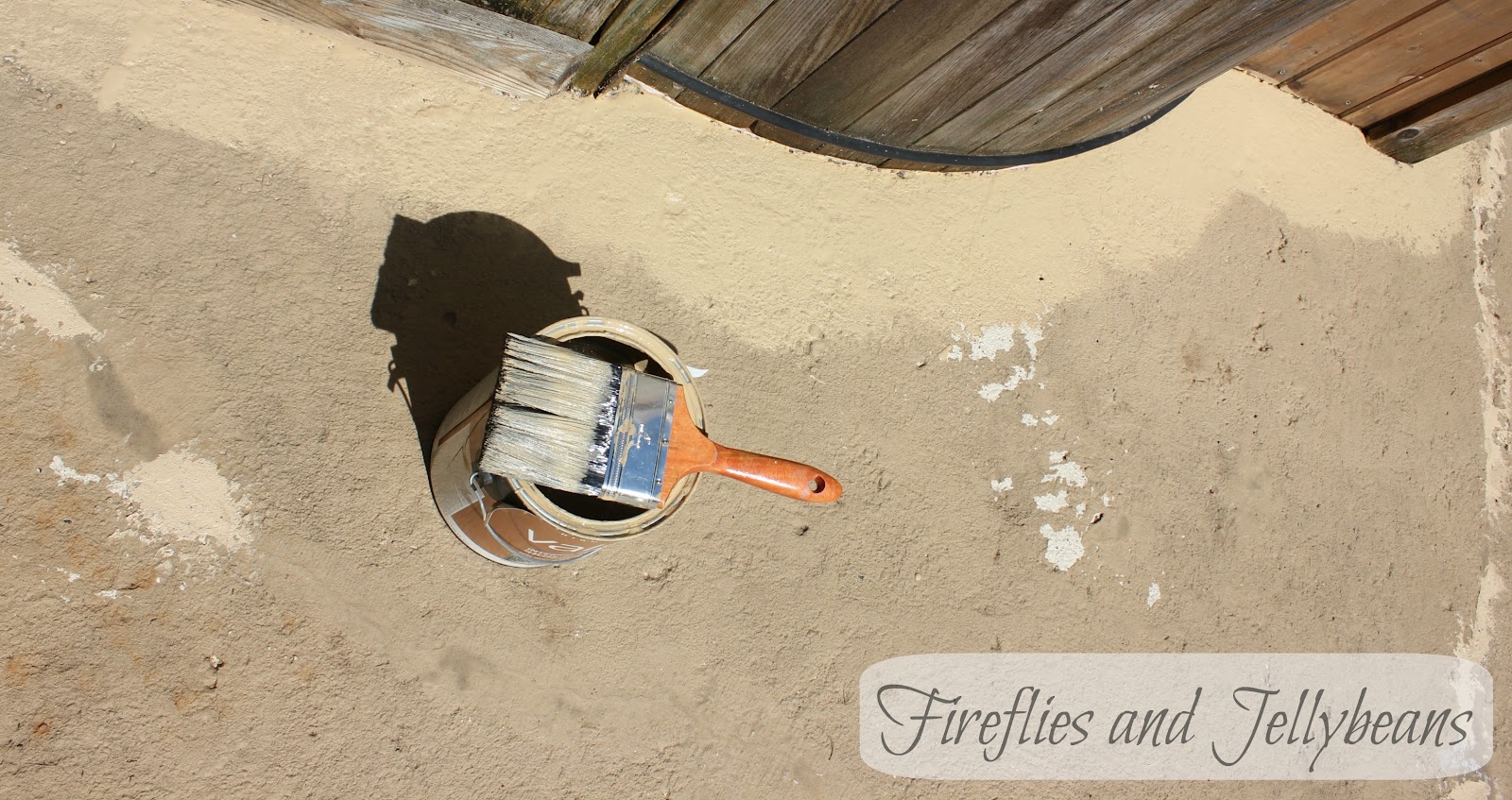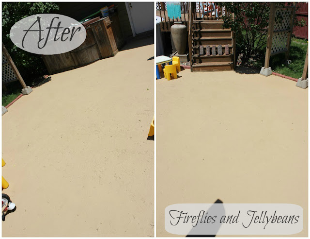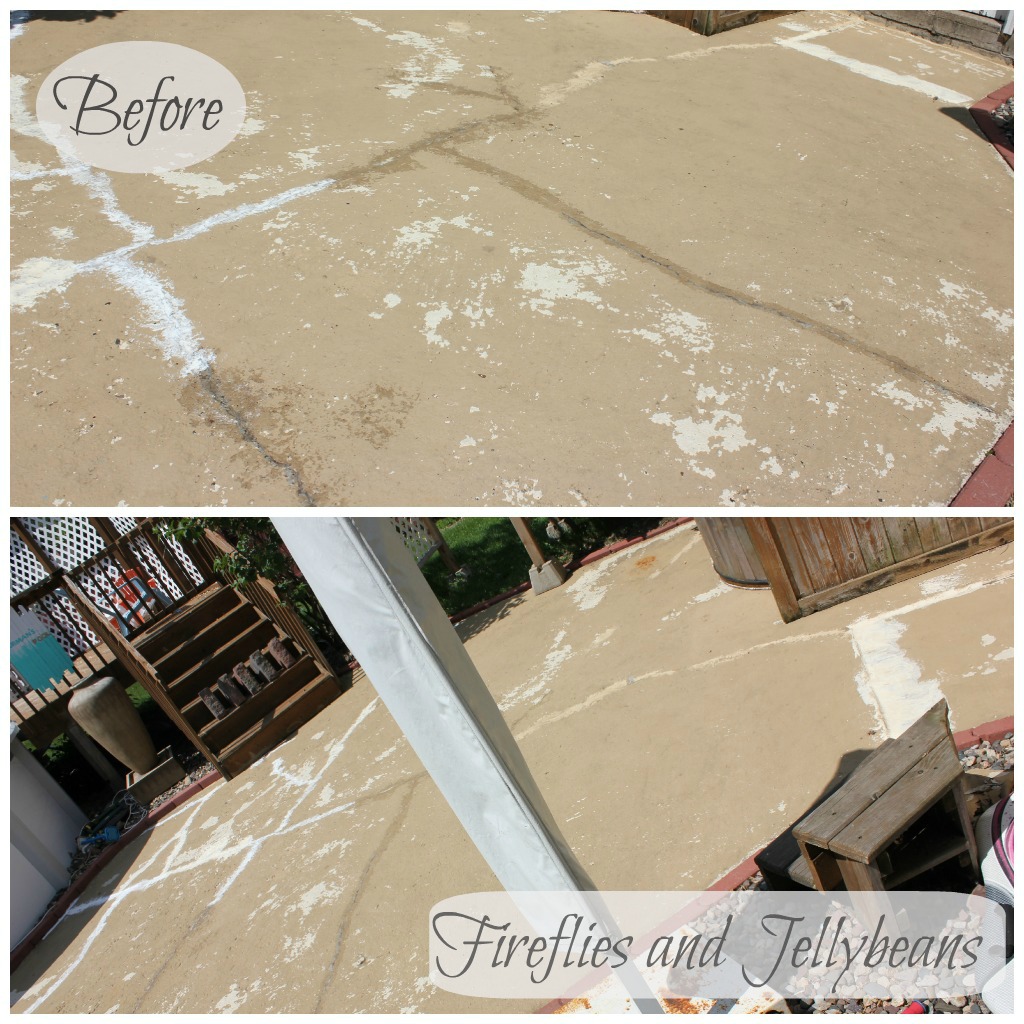 This before Pictures is not the real before. We have painted it for a while now. But Here is this years before picture. Before you start you want to pressure wash the patio and use outdoor paintable caulking to fill int the cracks. This picture shows you this step.